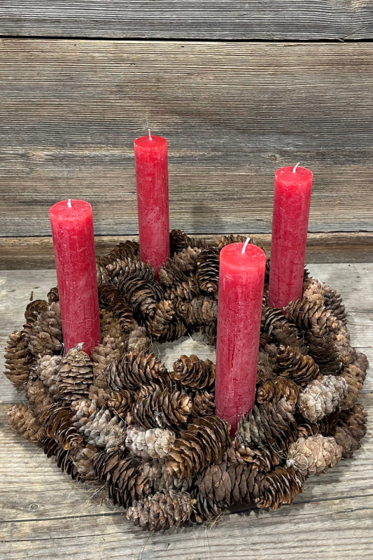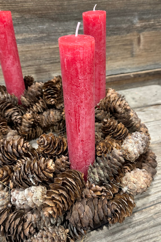 Entdecke, wie du einen rustikalen Adventskranz mit roten Kerzen ganz einfach selbst gestalten kannst.
