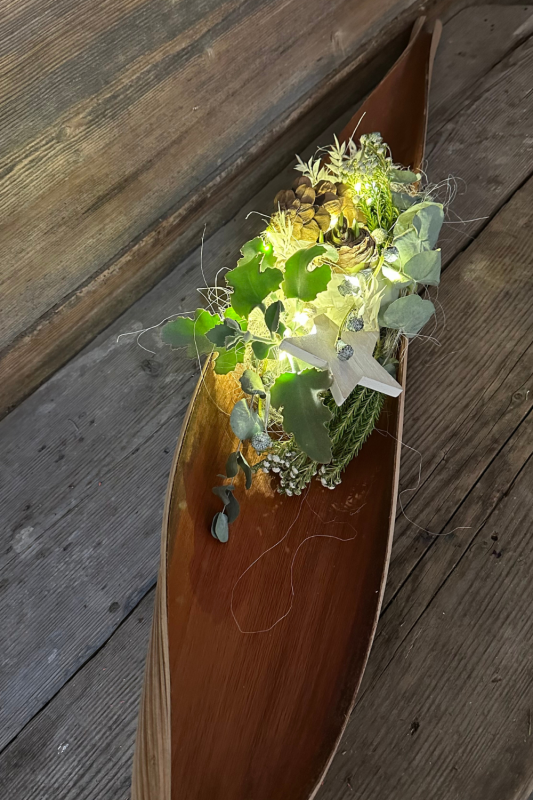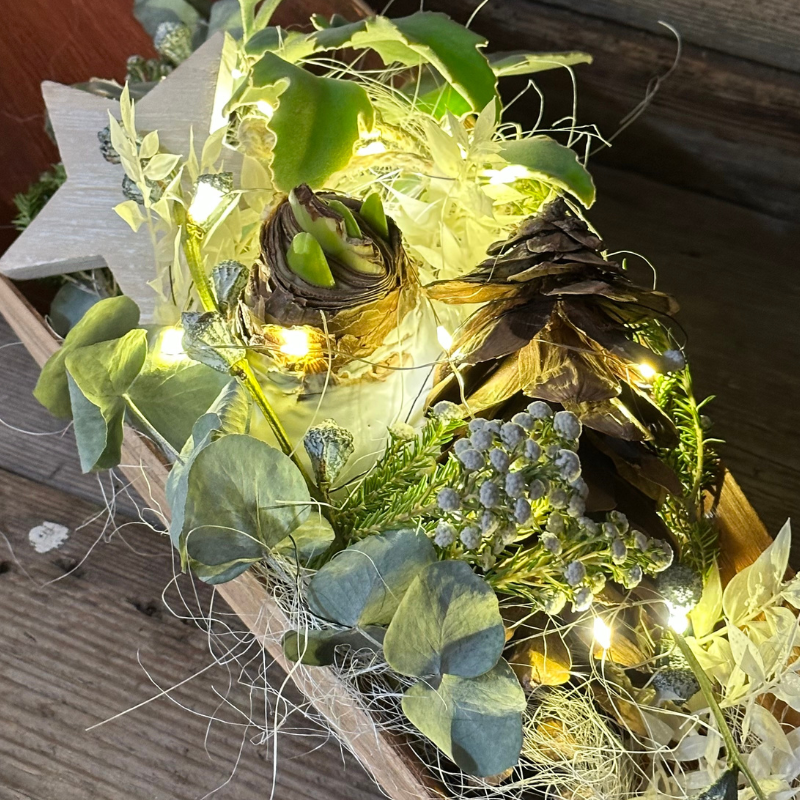Aus einem Stück Palm- oder Baumrinde entsteht mit Eukalyptus, weißen Akzenten, Tannenzapfen und einer warmen Lichterkette eine festliche Deko, die Natürlichkeit und Glanz verbindet.